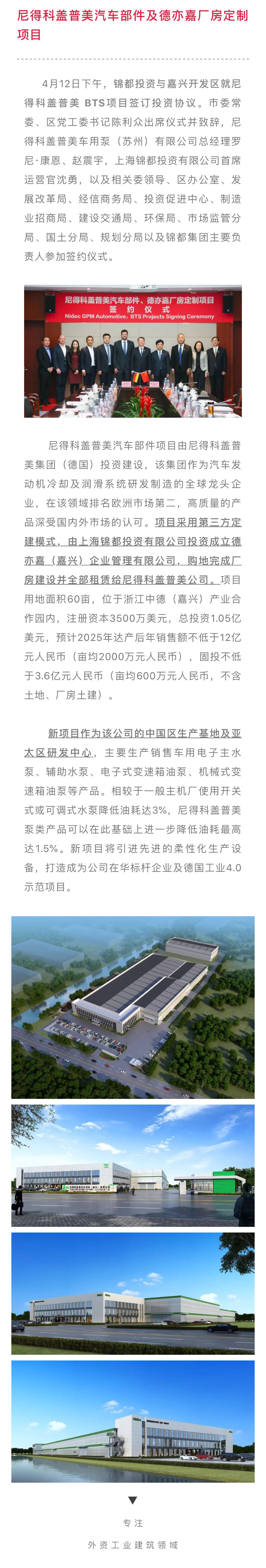 锦都投资与嘉兴开发区签订尼得科盖普美BTS项目投资协议